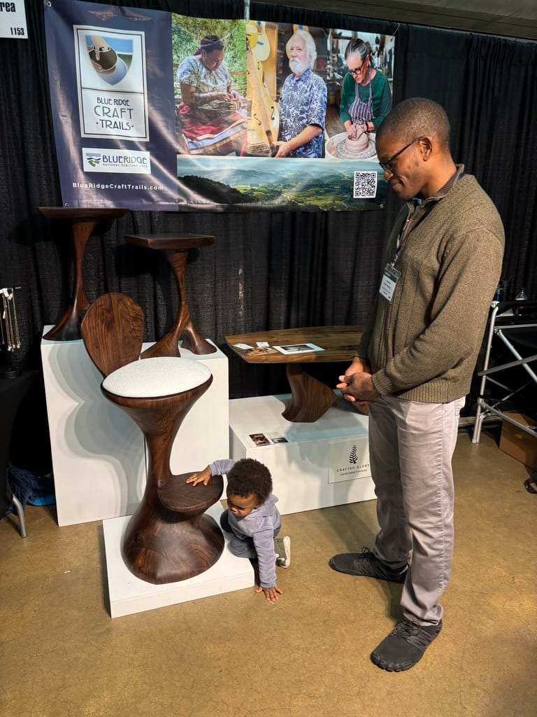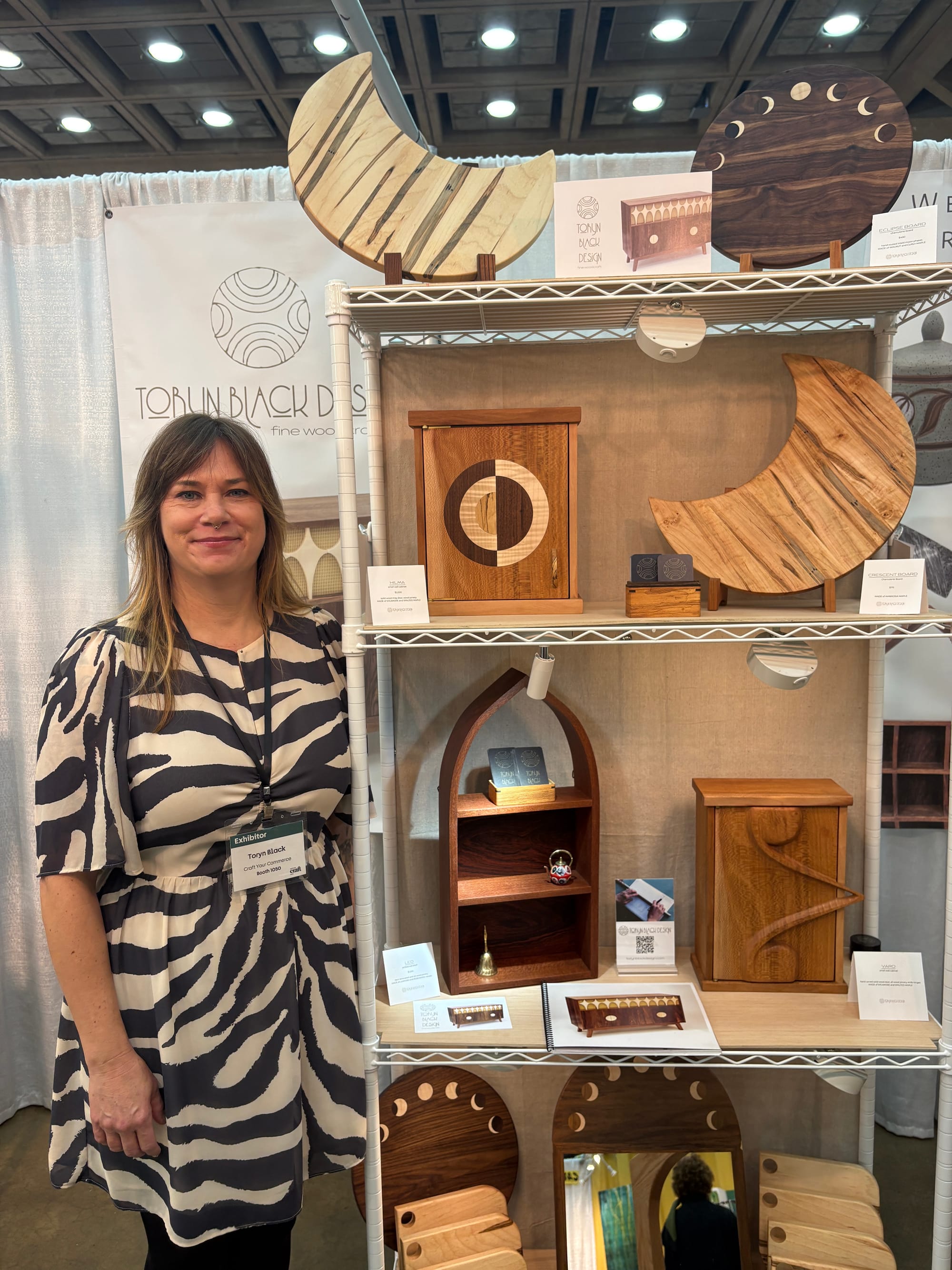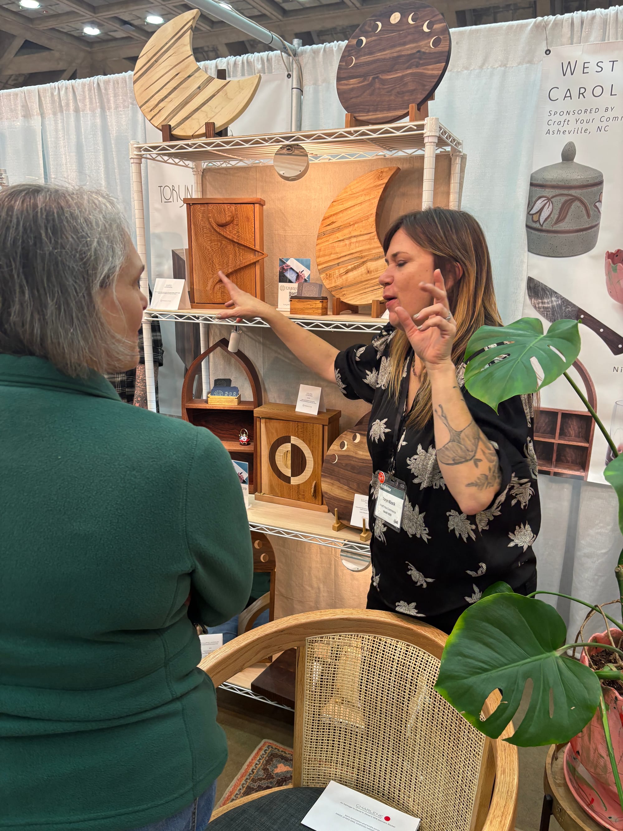 Woodworker Toryn Davis Black brought months of meticulous work to Craft Made Baltimore, showcasing mid-century modern furniture and homeware. Committed to sustainability, Toryn uses local Appalachian hardwoods alongside ethically sourced international woods. “I am deeply honored and honestly still a little stunned to be part of this,” she says, proud to exhibit alongside fellow WNC artists.