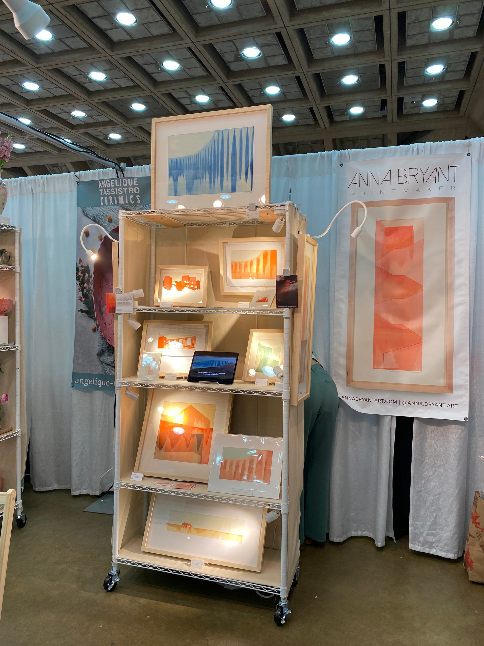 Anna Bryant, an Asheville printmaker, arrived at this year’s show with a portfolio of monoprints that seem to shift and settle as you look at them. Her work traces a quiet conversation between human design and the natural world. “The evolving imagery from one pull to the next documents change over time and the ongoing exchange between engineered and ecological systems.”