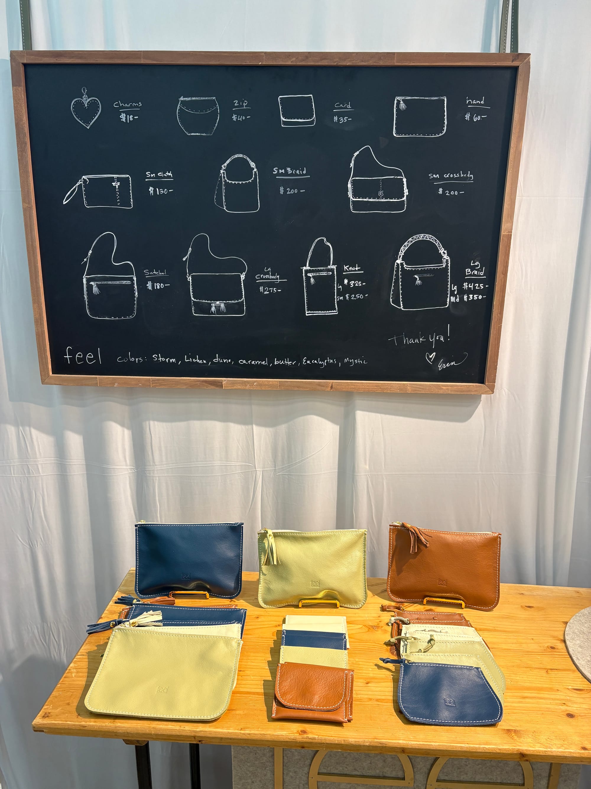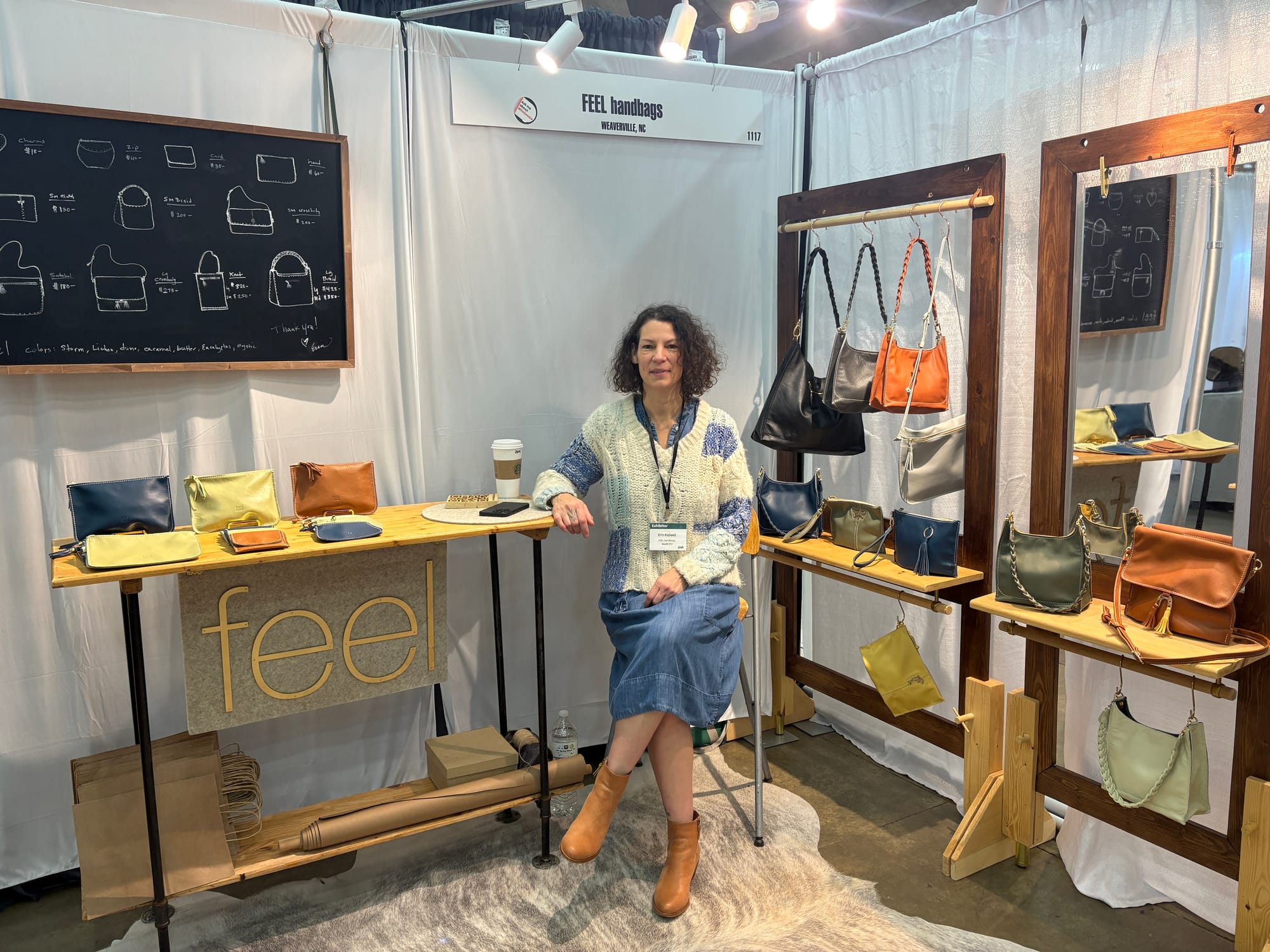 Erin Kaleel, the designer behind Feel Handbags, unveiled her collection of soft, supple bags, stitched in Asheville from Italian leather and finished with bits of precious metal. Her work is rooted in natural harmony and a kind of quiet luxury, the kind that feels good in the hand and lasts for years.