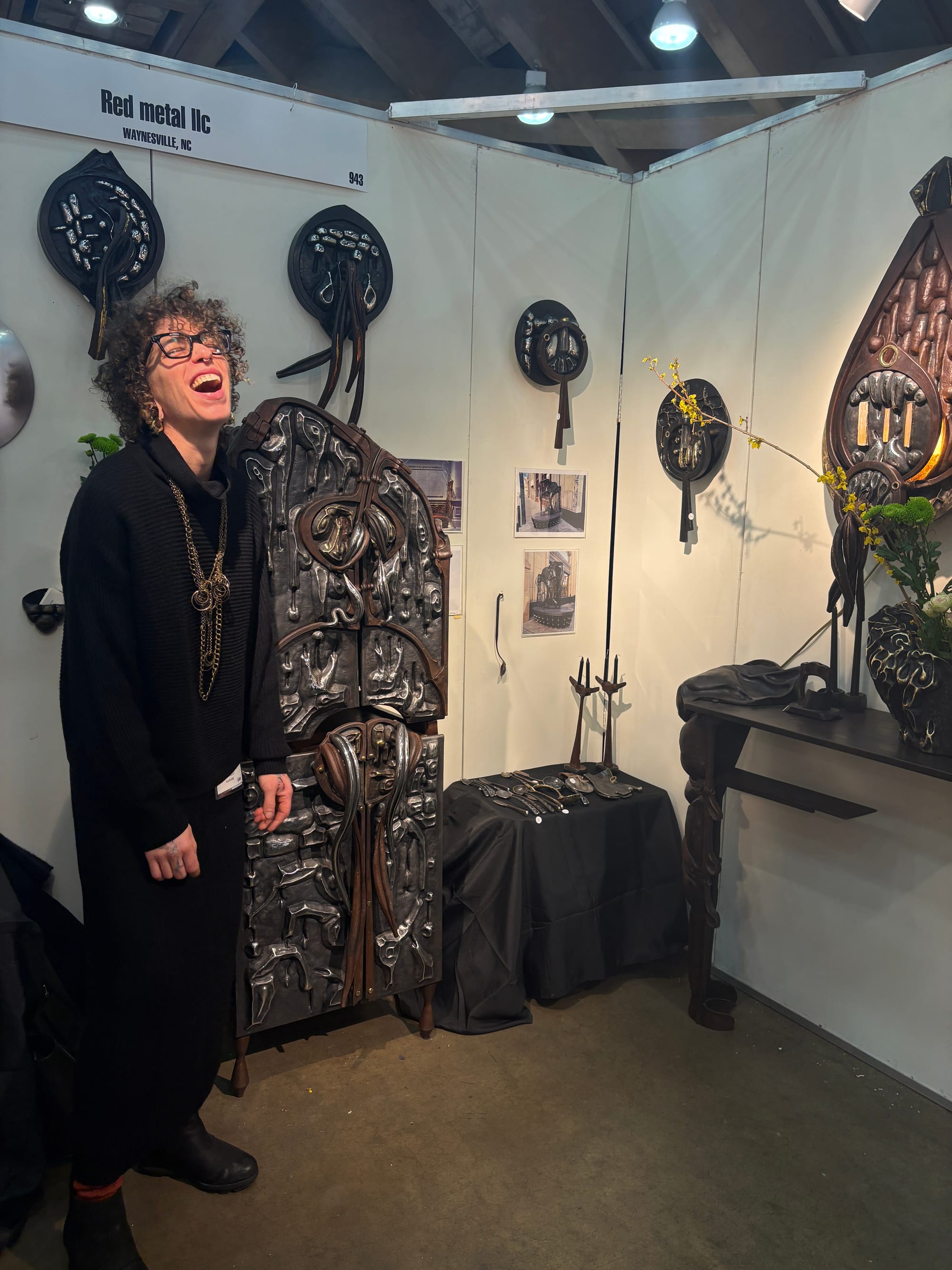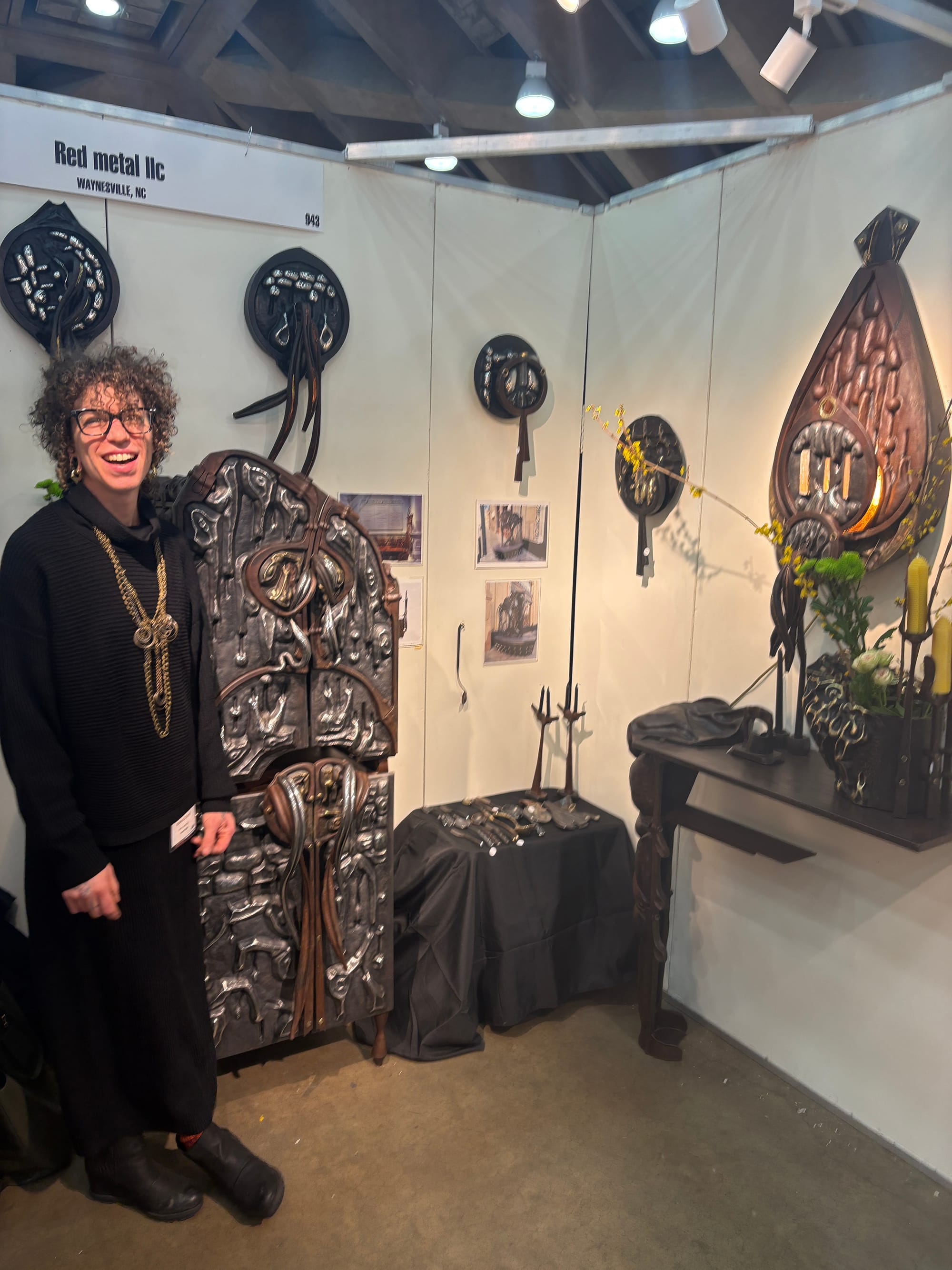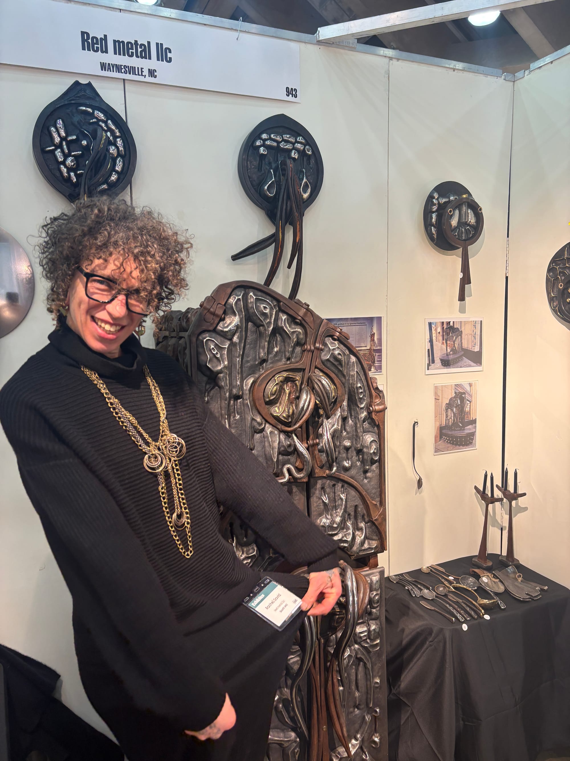 Rachel David, working under the name Red Metal, brought her forged metalwork to Baltimore, objects that blur the line between sculpture and furniture. Her art is grounded in social and environmental justice, inviting visitors to see how art, craft, and community come together in steel and fire.