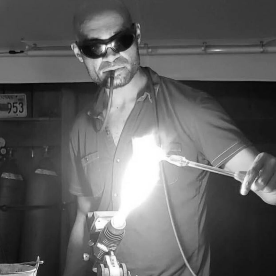 Mark DeShields began his glass career in 2004 at Salem Community College's Scientific Glass Technology program. After working as a scientific glass blower in Raleigh, he became a full-time pipe maker before relocating to Asheville to pursue glass art more seriously. In 2021, he transitioned to hot shop soft glass at the North Carolina Glass Center. His work in Liminal Light includes "Ethereal Ascension," which explores light refraction on polished surfaces with gold and silver fume.